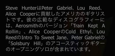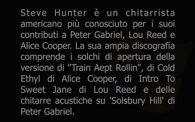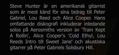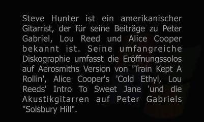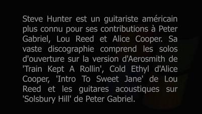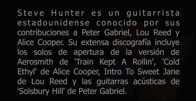 Steve Hunter is an American Guitarist best known for his contributions to Peter Gabriel, Lou Reed and Alice Cooper. His extensive discography includes the opening solos on Aerosmith's version of 'Train Kept A Rollin', Alice Coopers 'Cold Ethyl', Lou Reed's 'Intro to Sweet Jane' and the acoustic guitars on Peter Gabriel's 'Solsbury Hill'.